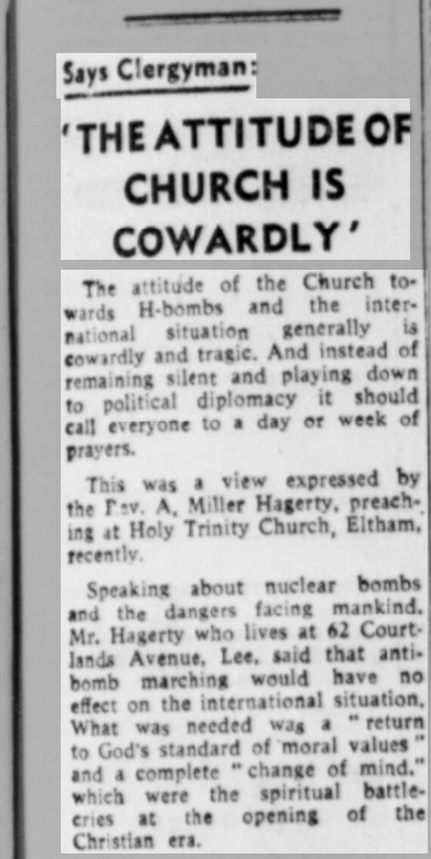 Speaking about nuclear bombs and the dangers facing mankind, Mr. Hagerty who lives at 62 Courtlands Avenue, Lee, said that anti-bomb marching would have no effect on the international situation. What was needed was a “return to God’s standard of moral values” and a complete “change of mind,” which were the spiritual battle-cries at opening of the Christian era.