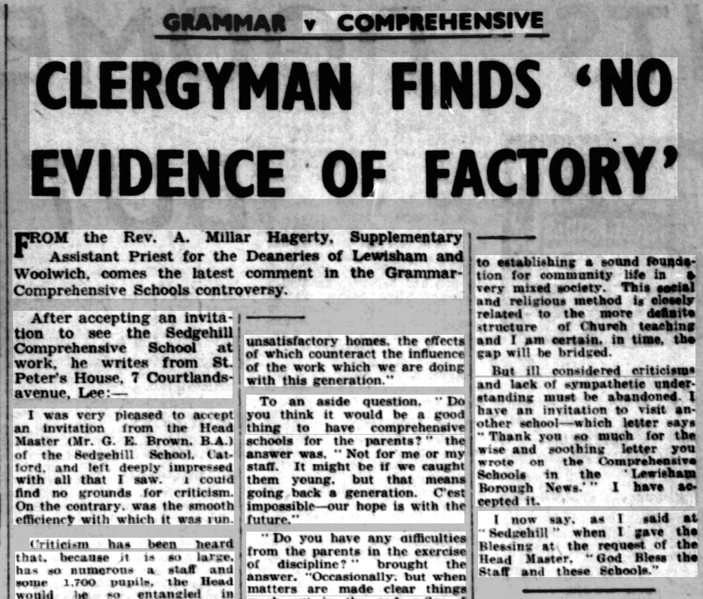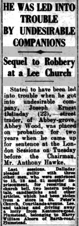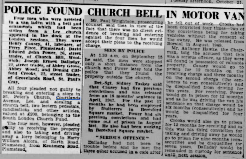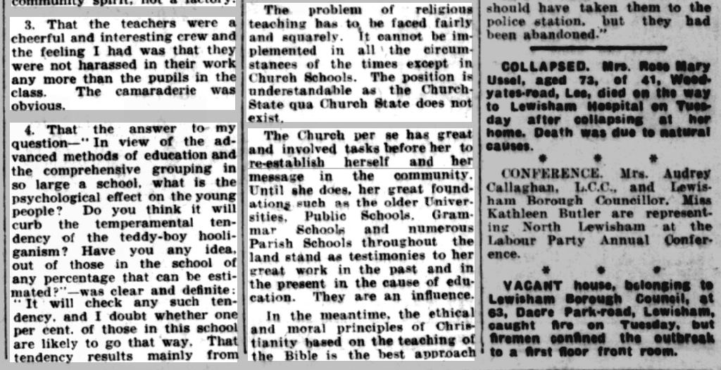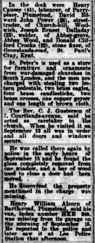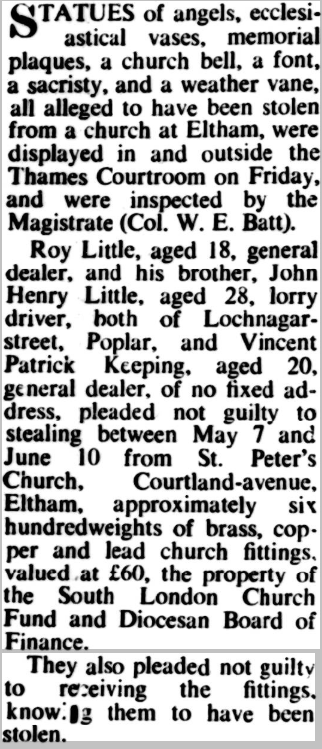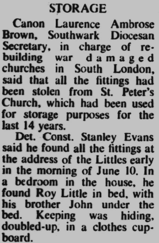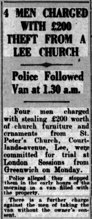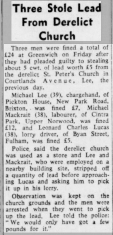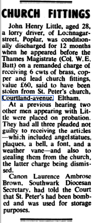 St Peter’s parish church, on the corner of Courtlands Avenue (right) and what is now Lyme Farm Road (foreground), was built in 1871. The church was closed in 1939 due to poor attendance. The building survived World War 2, being used for storage, and was not officially redundant until 1960. The site was sold in 1961 to Wates for housing development for £5000: the extent of the church building is represented by the nearest block in this photo and the one to the left of it.