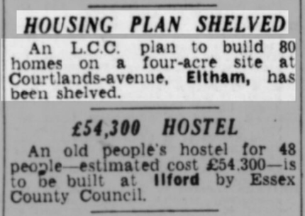 The L.C.C. lost the right to build homes on a four-acre site at Courtlands Avenue, Eltham, because it was unable to offer a competitive price for it. That was the view expressed at Tuesday’s meeting of the County Council by the chairman of the Housing Committee (Mr. W. G. Fiske).