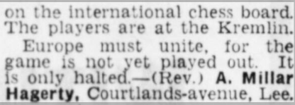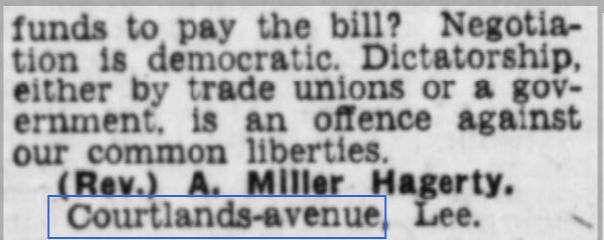 That change “inflicts itself on the community life socially, economically and even religiously,” he added in his letter to the Sydenham, Forest Hill & Penge Gazette’s “You Tell Us” page. “Road traffic bewilders us, housing is an ever growing problem, the equitable adjustment of wages and prices, the turmoil of strikes, with thier dislocations, are a nightmare.” Beyond Courtlands Avenue, things were even worse. “The international strife of the powers breed the fear of the possible disintegration of civilisation.”