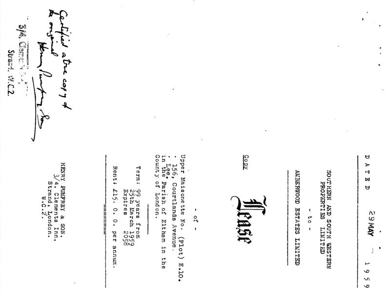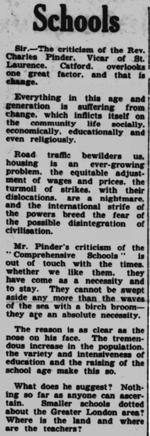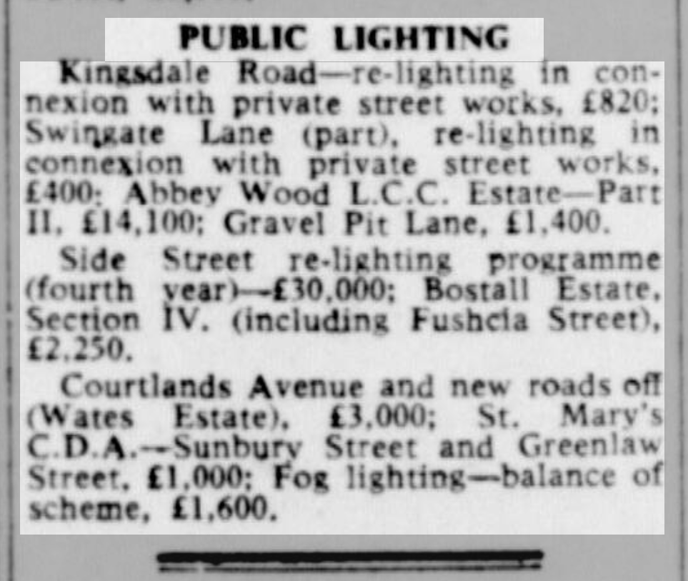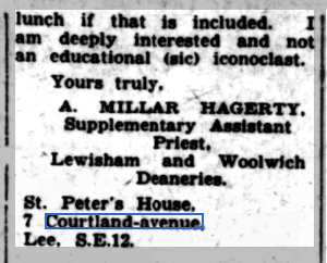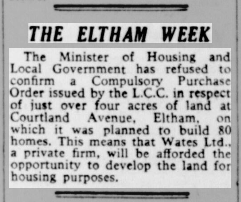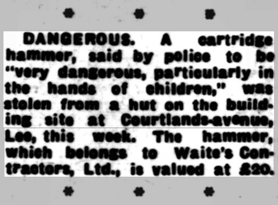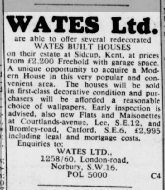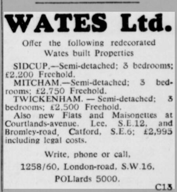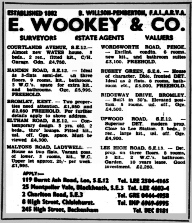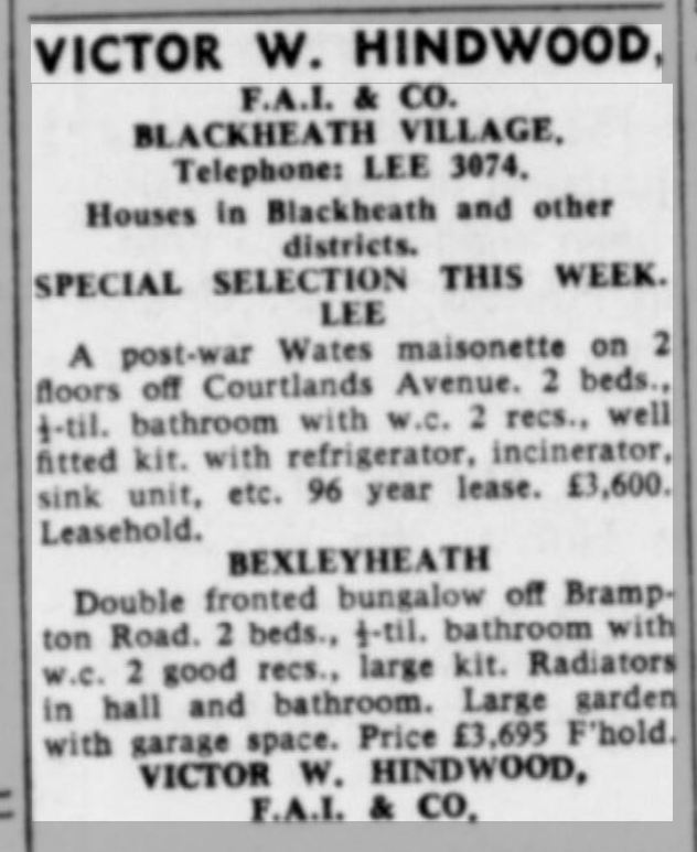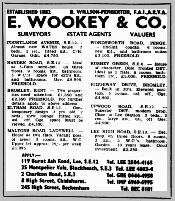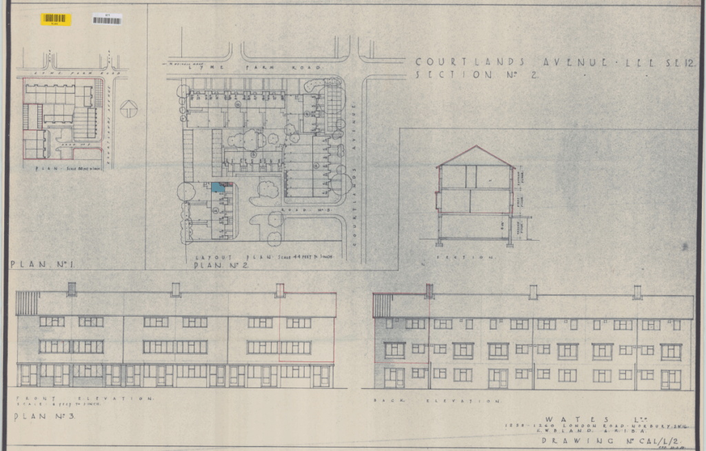St Peter’s parish church, on the corner of Courtlands Avenue (right) and what is now Lyme Farm Road (foreground), was built in 1871. The church was closed in 1939 due to poor attendance. The building survived World War 2, being used for storage, and was not officially redundant until 1960. The site was sold in 1961 to Wates for housing development for £5000: the extent of the church building is represented by the nearest block in this photo and the one to the left of it.